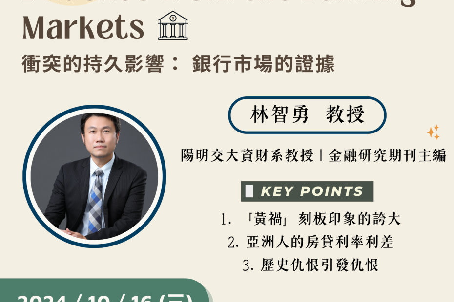 講員:林智勇教授金融研究期刊主編、陽明交大資財系教授日期: 113.10.16 (三)時間:13:10~15:00地點: 商學院商學大樓30… Read More »【國際校園活動系列講座】《衝突的持久影響:銀行市場的證據》
