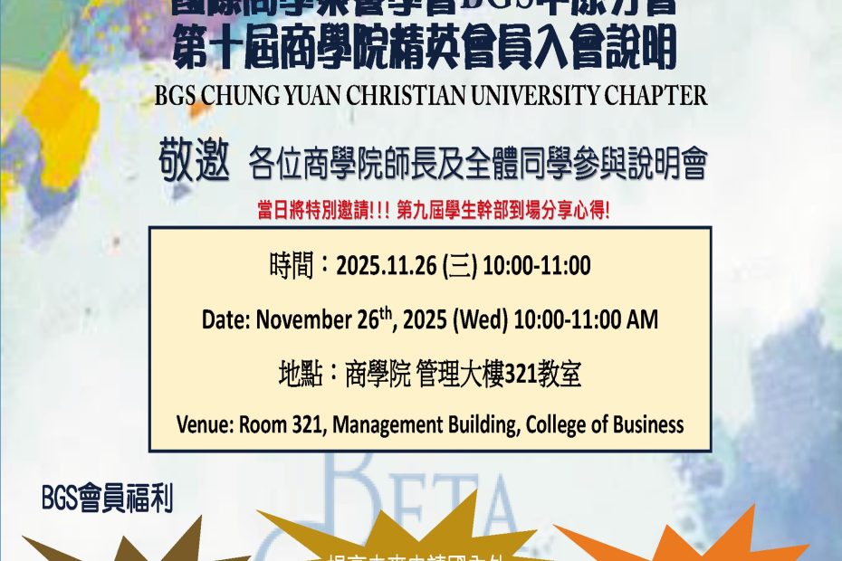 主 講 人:商學院 商管品質促進與認證辦公室 陳佑倫 執行長時 間:114.11.26(週三)上午10:00-11:00地 點:中原大學商學… Read More »第十屆國際商學榮譽學會(Beta Gama Sigma)中原分會說明會,歡迎各位師生踴躍參加!!!