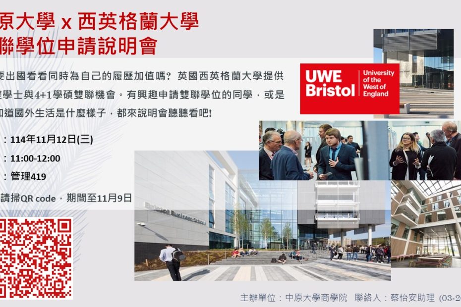 想出國拓展視野、又能同時替自己的履歷加分嗎?英國 西英格蘭大學(University of the West of England, UWE… Read More »中原大學 x 英國西英格蘭大學 雙聯學位申請說明會