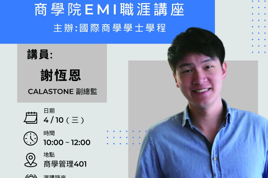 此次演講非常榮幸邀請到Agoda台灣總經理-齊彥喆到校分享!若您對旅遊業有興趣,絕對不要錯過此次機會!歡迎有興趣的同學踴躍報名參加!報名連結… Read More »【商學院EMI 職涯講座】旅遊業的職涯發展-Agoda